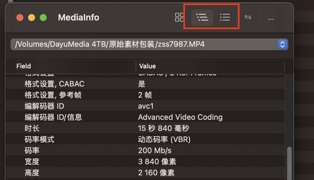 dayu 免费资源 15小时前 影视狗必装软件视频信息查看器Mediainfo Mac版 可以查看视频的所有参数,包括采样率 位深。市面上有傻狗 自己不买高速卡或者忘记格卡,悄悄的把拍摄格式降为8bit 420,这个软件专治这种傻狗。 使用方法,安装软件后对视频文件右键点击打开方式-Mediainfo,然后点击列表模式就能看到所有详细信息 例如我今天就发现,某影视公司找我做特效包装,结果发给我的是代理素材。不是原素材