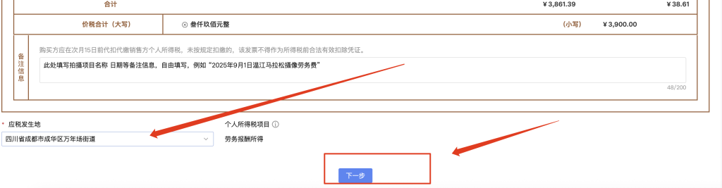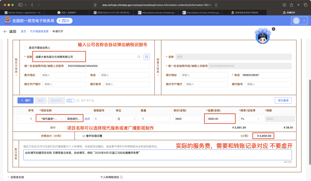 关键信息为公司名称和税号,这个需要你的合作方发给你。然后是项目名称,对于摄影摄像后期制作可以选现代服务或者广播影视制作发布,含税金额就是最终金额。规格单位数量这些随意填,主要是总价对得上就行。备注信息可填可不填,应对审计的话可以严格按照真实劳务服务填写