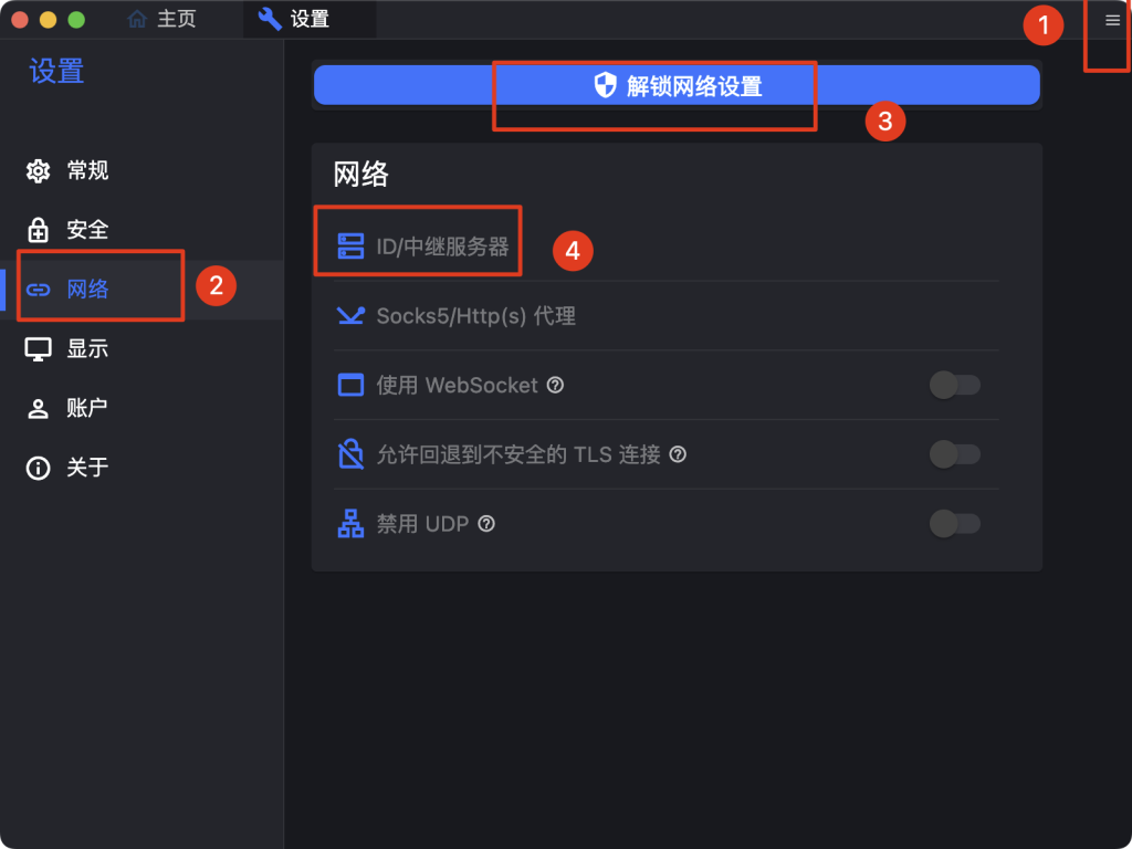 点击右上角三条杠进入设置界面,点击网络,点击解锁网络设置,输入开机密码后点击ID/中继服务器