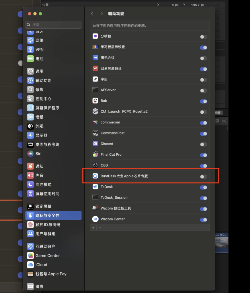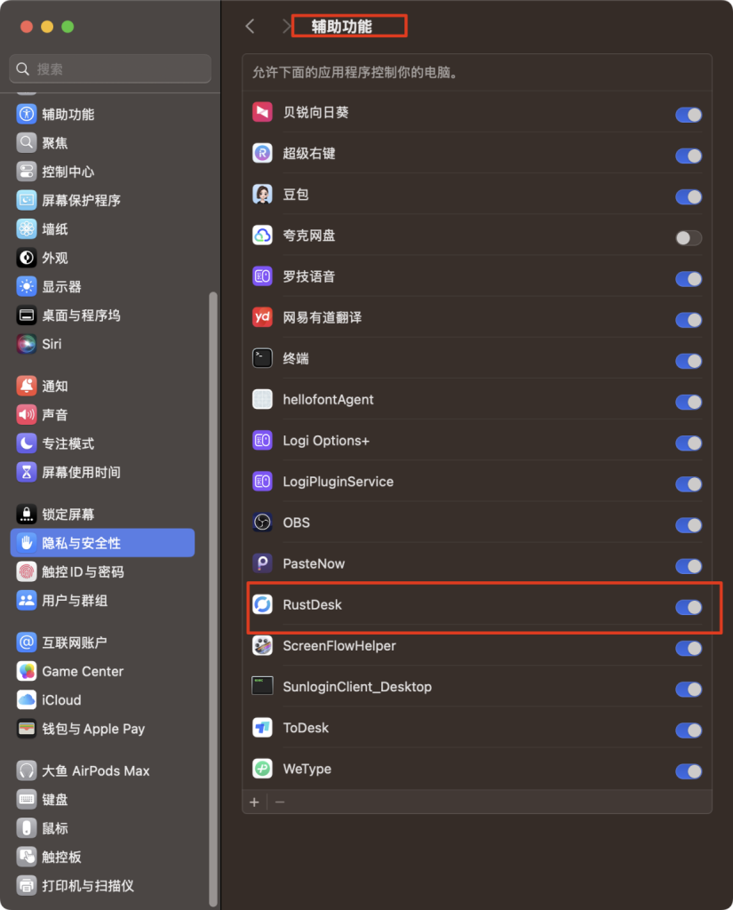 这个大鱼专版是Apple芯片1.4.5版本,内部配置好了网络接口,屏蔽了版本更新提示,配置好权限就可以直接用了。其他版本请去官网下载-官方更新地址https://github.com/rustdesk/rustdesk/releases/,官方版除了权限配置,还需要按照文章指引配置网络接口才能使用我自建的服务器接口。