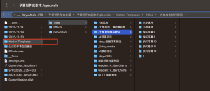 插件位置:解压后右键资源库,显示包内容,找到Motion templates文件夹,里面就是该项目用到的所有的插件,包括效果、字幕、发生器、转场。注:效果和发生器是宽屏项目和标准项目通用的,少部分字幕如果用于标准项目需要在Motion中调整位置避免元素在画面外显示