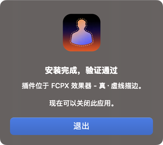 拖入应用程序文件夹后,需要去启动台打开一次应用。出现以下提示才是安装成功。请务必关闭FCPX和Motion安装。安装完成后打开FCPX在效果中找到真·虚线描边拖入素材上面使用。注意,描边插件需要预先抠图或者给透明通道素材使用才有效果,普通素材使用只会生成矩形边框。描边描边,你得有边才能描,这是常识。参数都很简单没有特别要讲的。