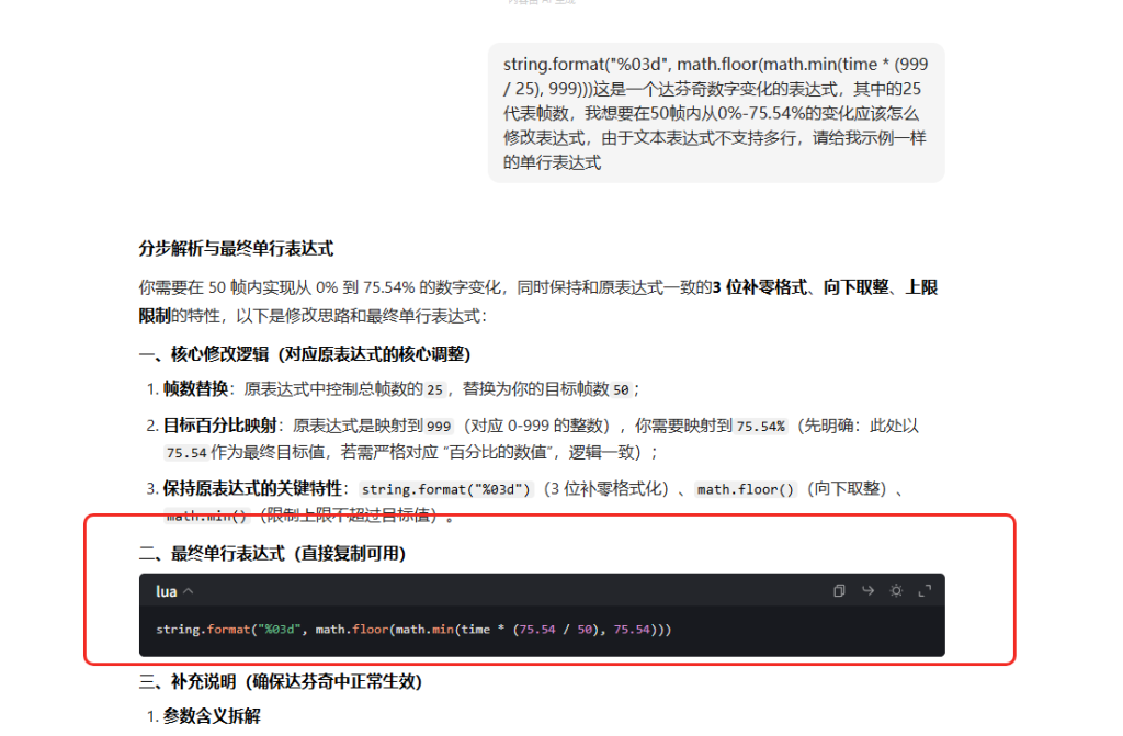 请严格按照我上面的提示词提问,才能得到正确的答案。AI会把25错误的认为是秒数,所以一定要给他指明那是帧数,AI默认会给出多行表达式,但是只有Fusion里面的修改器表达式才能支持多行脚本,我们在时间线上一定要拿到单行表达式。
