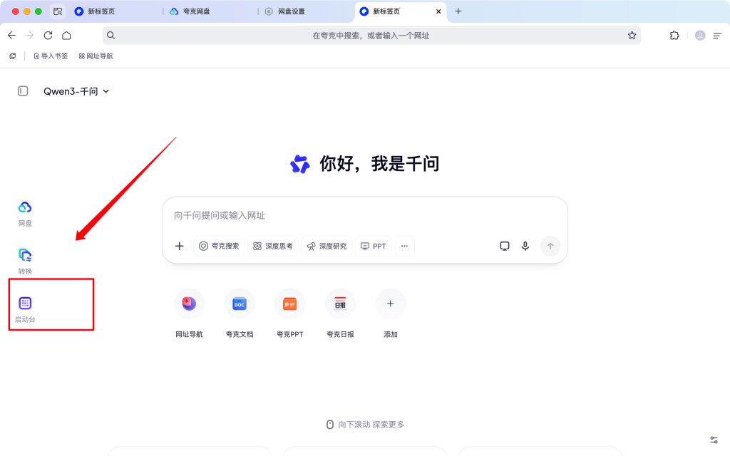 还有另一个最接近原生启动台体验的就是夸克启动台,他没有单独的APP,需要下载夸克客户端,在左下角就有一个启动台图标,点击后自动安装,将它在程序坞常驻即可