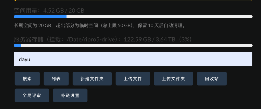 网盘服务器总容量只有4T,没办法,现在机械硬盘的价格高的太离谱了,本云盘系统半年前就开发完成了,想等到硬盘降价后扩容后发布,目前看来是等不到了。如果本站会员超过300人我会咬牙买一块16T进行扩容。分配给每个会员的常驻容量是20G,临时容量50G,足够日常使用了。