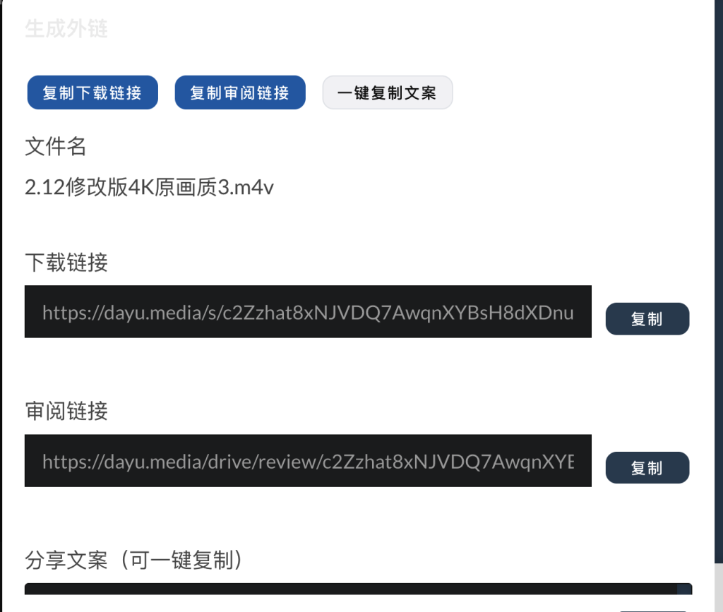 上传文件后点击分享即可一键复制下载和审阅链接(点击一键复制文案就是同时复制两个链接和基础文案)