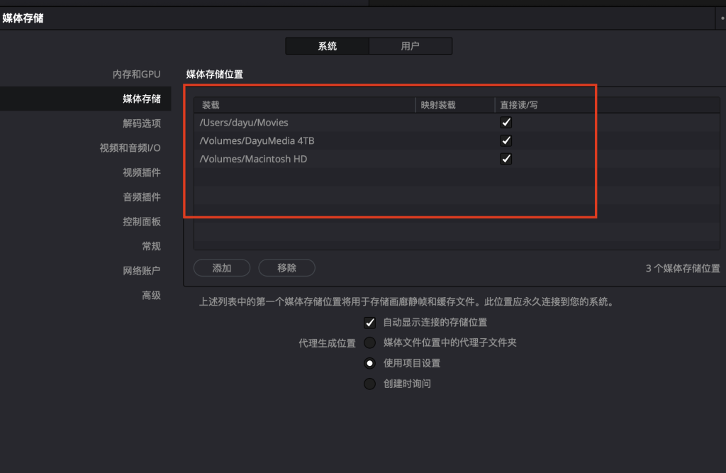 素材所在路径必须加入达芬奇媒体路径才能被达芬奇加载。一般在达芬奇初始设置我们就会将整个Mac或者外接磁盘加入媒体存储位置。