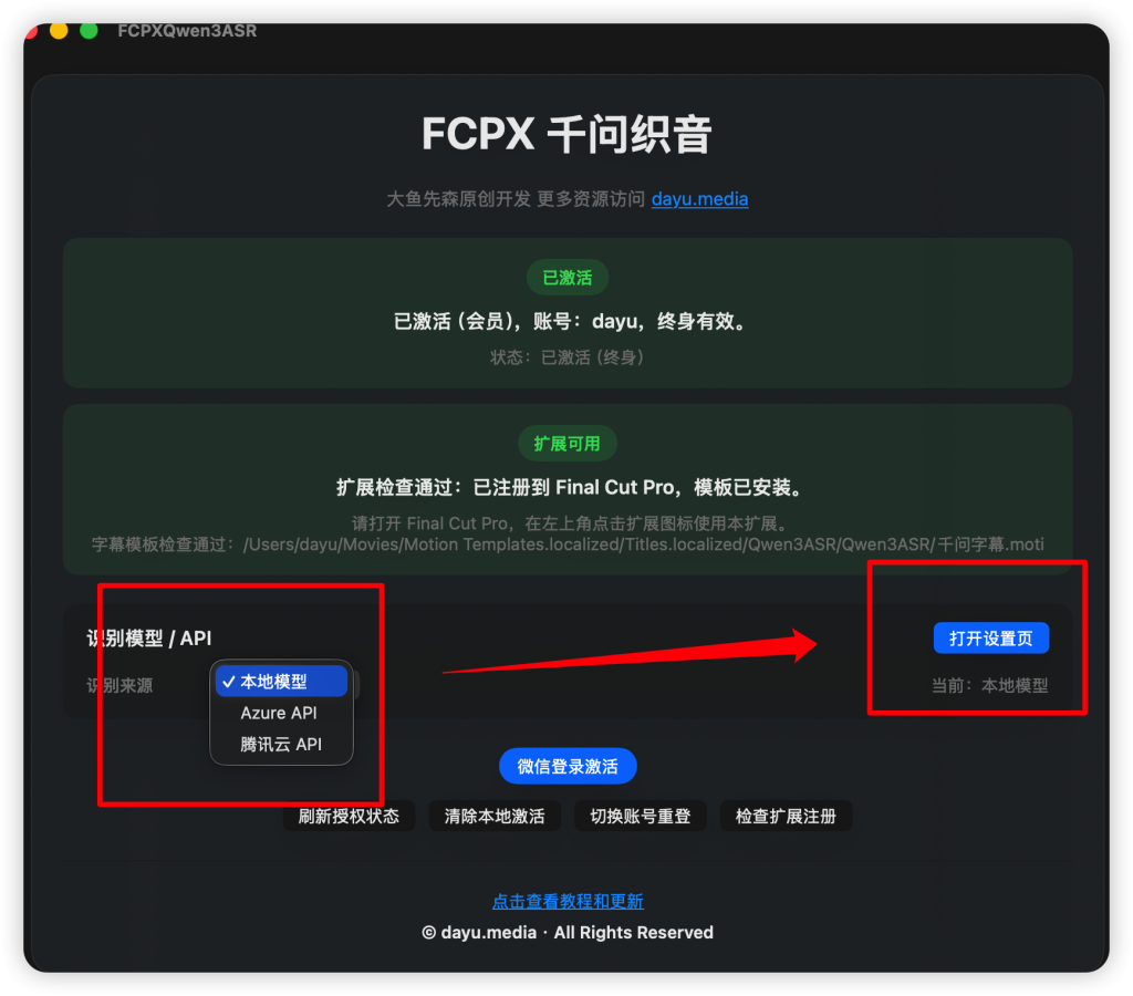 mCaptionsAI是DesignStudio的附属程序,必须要安装整个高达16GB的DesignStudio包和2GB的whisper模型包,还不能删减不需要的文件。由于严格的文件完整性检查,很容易误操作动了文件导致激活失效需要重新激活。FCPX千问织音整个程序+模型只有3GB,使用简单的微信登录激活,不会出现中途激活失败的情况。