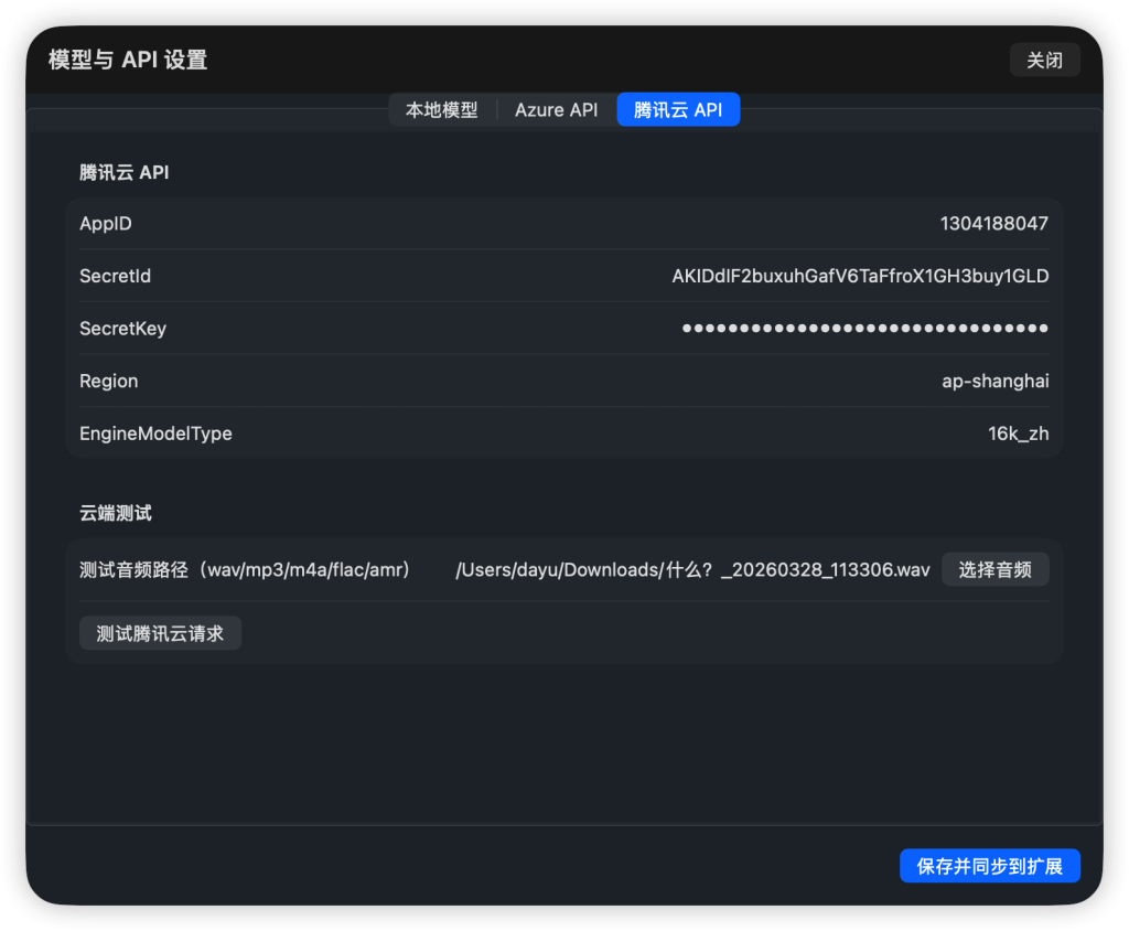 如果你申请了腾讯云语音识别API,请再在此填入,并使用本地音频测试是否连通。腾讯云API申请地址https://console.cloud.tencent.com/asr (免费,微信登录即可)