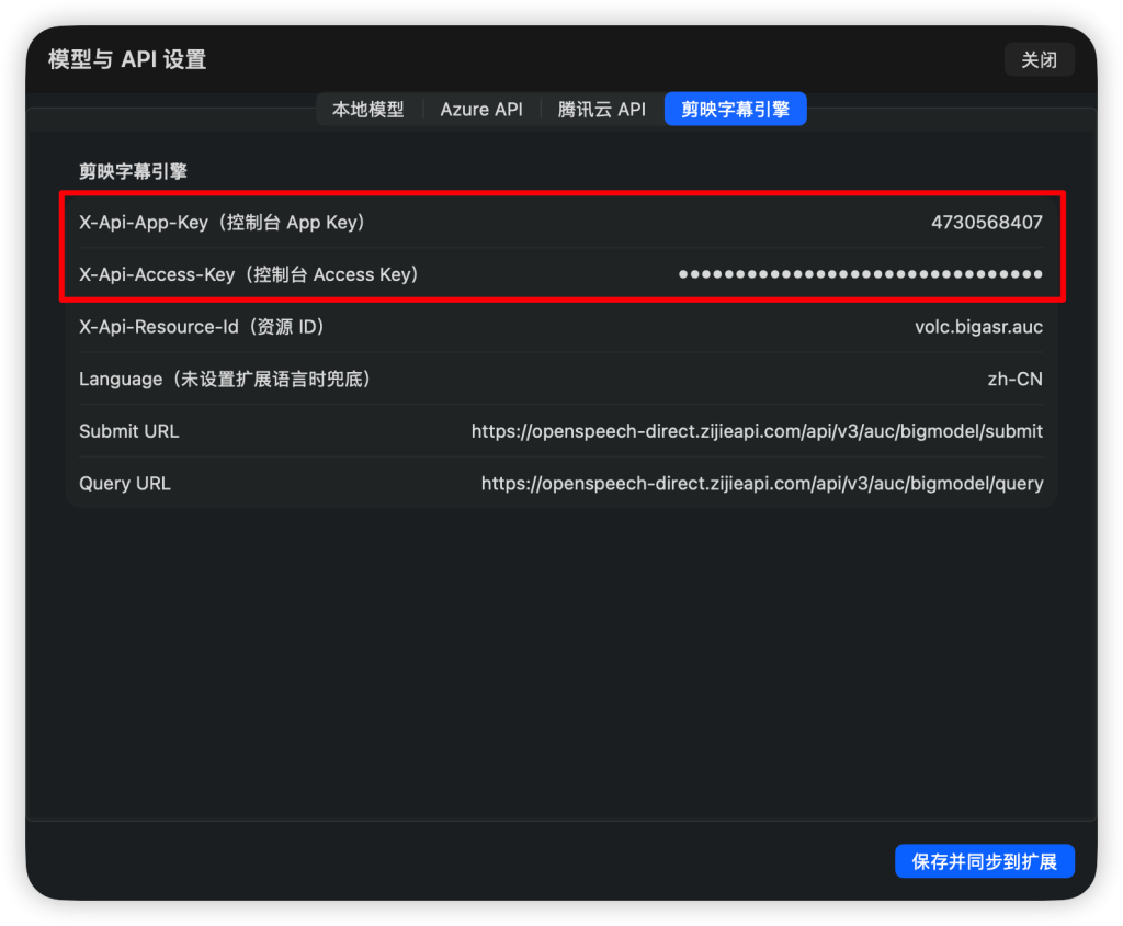 - 接入剪映字幕识别引擎-火山引擎豆包录音文件识别。开通免费额度领取地址https://console.volcengine.com/home(20小时额度90天有效期)正式调用3.5元/小时。具体流程请询问豆包。将获取到的key填入设置页面中即可使用剪映字幕引擎。开通后到https://console.volcengine.com/speech/service/10012复制App Key和Access Key填入设置页面。