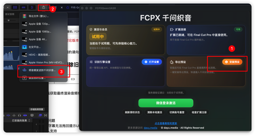 在试用过程中遇到任何问题,请将下载目录的“FCPX千问织音”文件夹打包发给我,微信:Dayumedia2