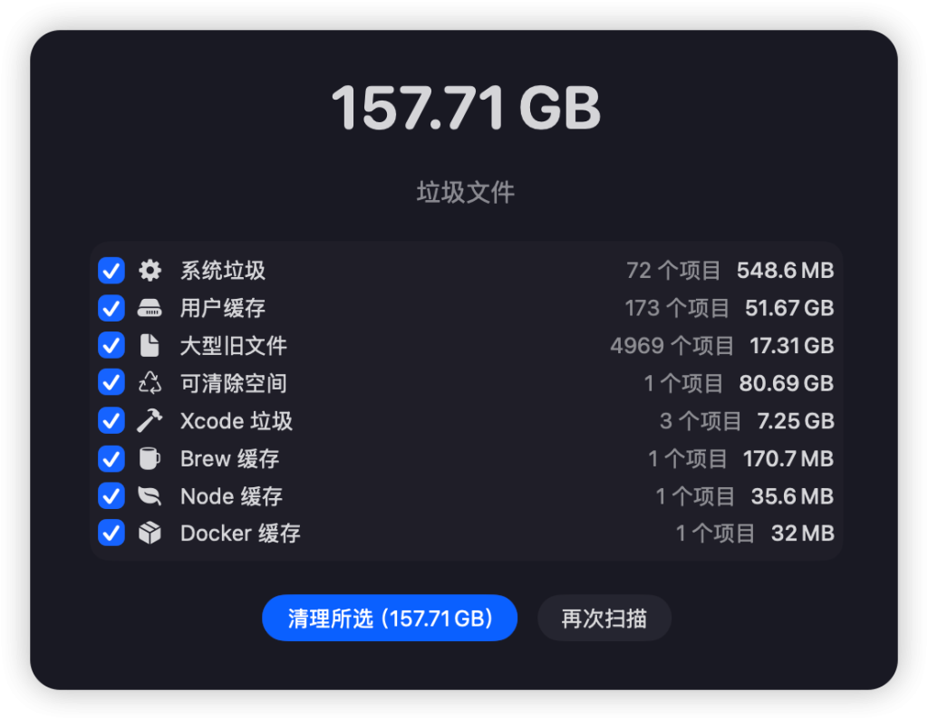 | 核心功能 | 系统垃圾、用户缓存、孤立文件、Xcode/Homebrew、大文件/旧文件、邮件附件、Trash、purgeable space(支持 Time Machine 快照彻底清理)、定时自动清理 | 系统/应用垃圾、大文件、重复文件、相似照片、浏览器隐私、应用卸载、状态栏监控(CPU/温度/风扇/网速)、摄像头/麦克风保护 | 专注应用彻底卸载 + 残留文件扫描 | 最全面:垃圾清理、卸载、重复文件、恶意软件扫描、性能优化、维护脚本等 |