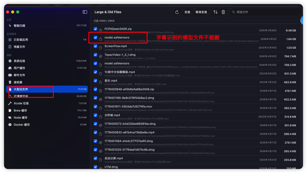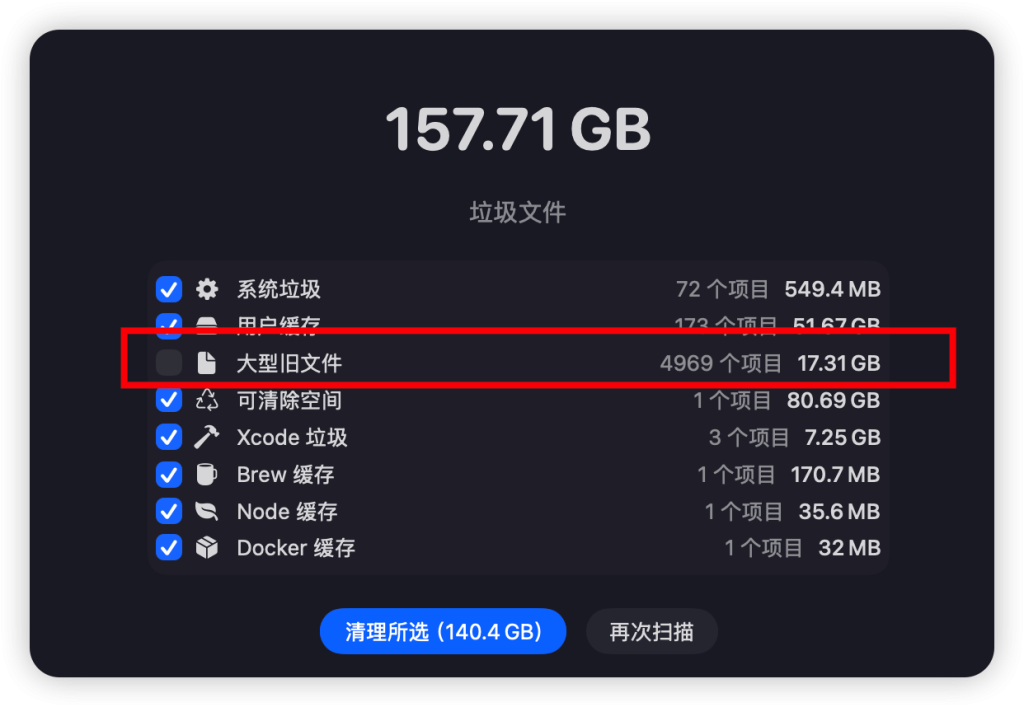 我还是信不过有些大傻子不看说明直接乱删,我把大型旧文件从智能扫描中取消自动勾选了,避免有些手快党直接点了删除。这个仅在汉化版中有效,原版没有这个。
