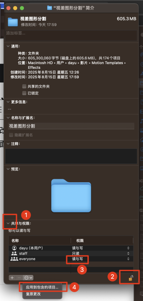 1、点击修改没反应无效。通常是插件目录被锁了权限不允许修改。在访达中右键插件目录选择显示简介,拉到最下面点开“共享与权限”,点击锁止符号解锁,将everyone的权限改为读与写,然后应用到子文件夹