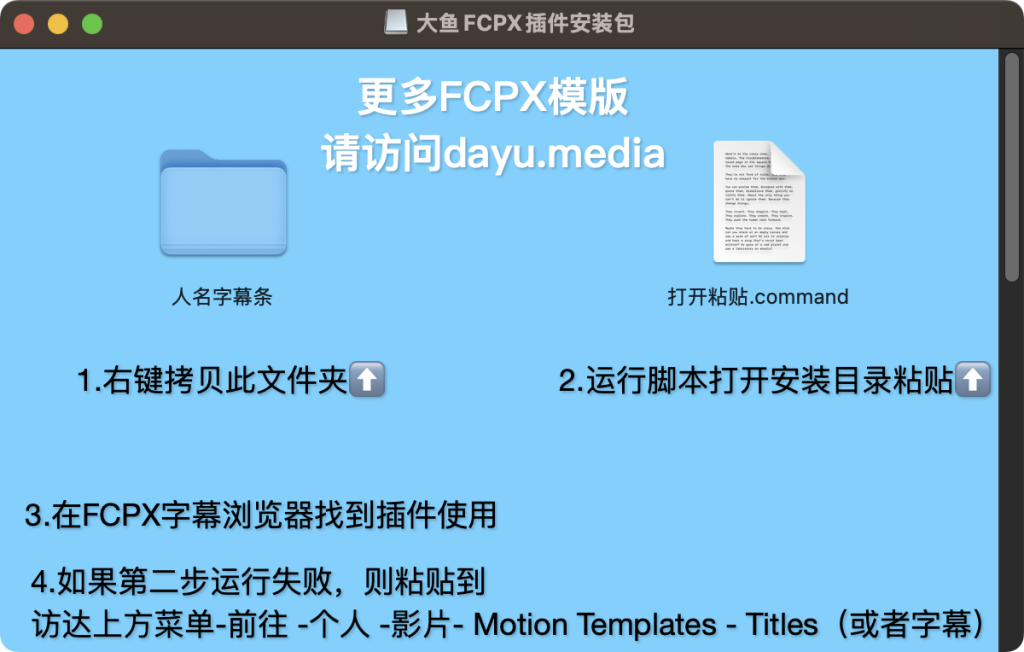 dayu 会员免费 原创付费 2025-08-25 大鱼早期FCPX人名条模板V1 很久以前做的了,从淘宝店迁移到本站 视频中提到的blender模型 红旗.blend下载 安装方法:安装界面写的这么清楚了还不会装的话 我TMD也没办法了