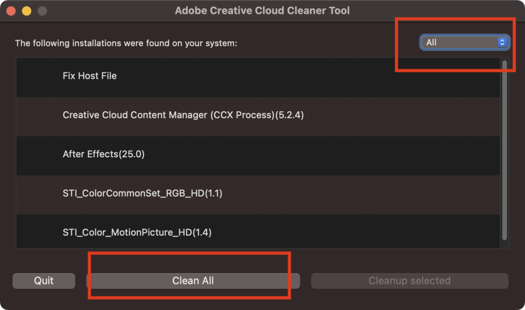 先运行Adobe清理工具完全清理掉Adobe所有软件和缓存。此步会完全卸载清理电脑上所有的Adobe痕迹包括软件、插件、缓存,你如果手上有未完成的工作请先完成再继续。同时请你再次阅读文章开头的警告部分,这一步没有后悔药。由于各个团队的破解版本互相冲突,所以这一步是必须要做的