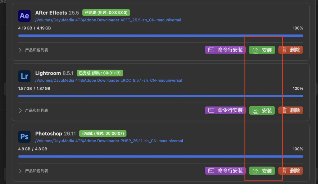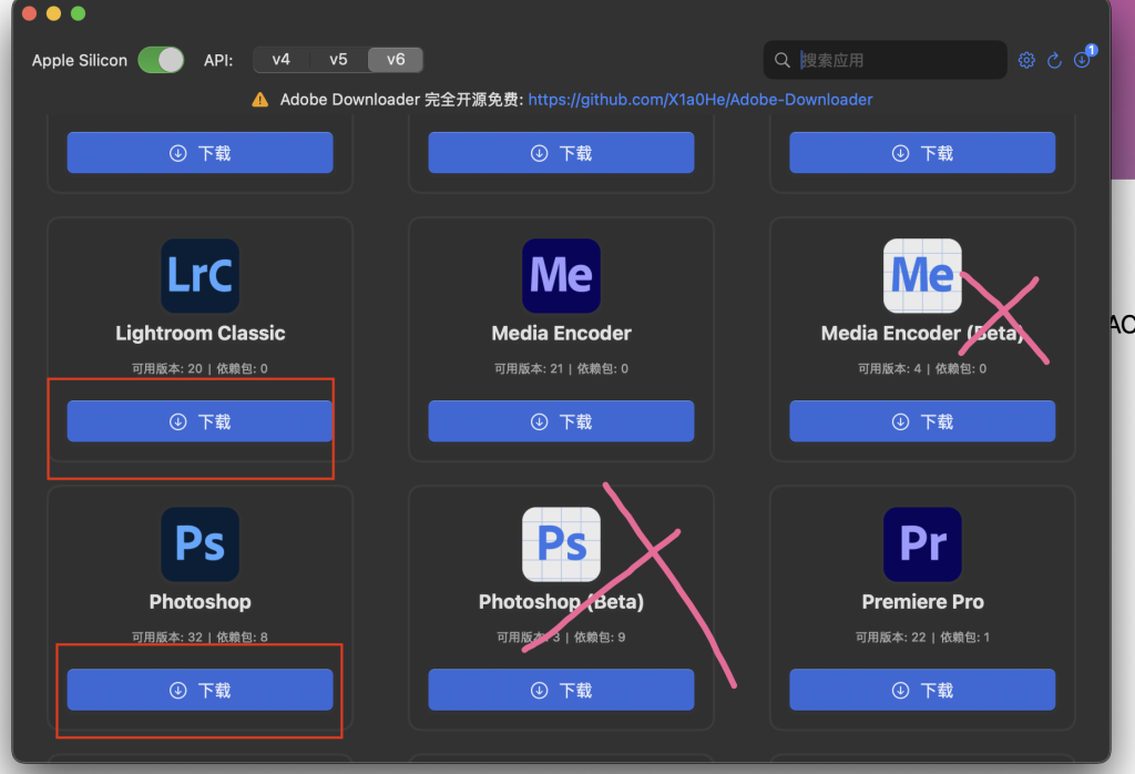下载Adobe软件下载器,在里面选择需要的软件下载(请勿在ACC中安装软件,必须在下面这个安装器中下载软件)